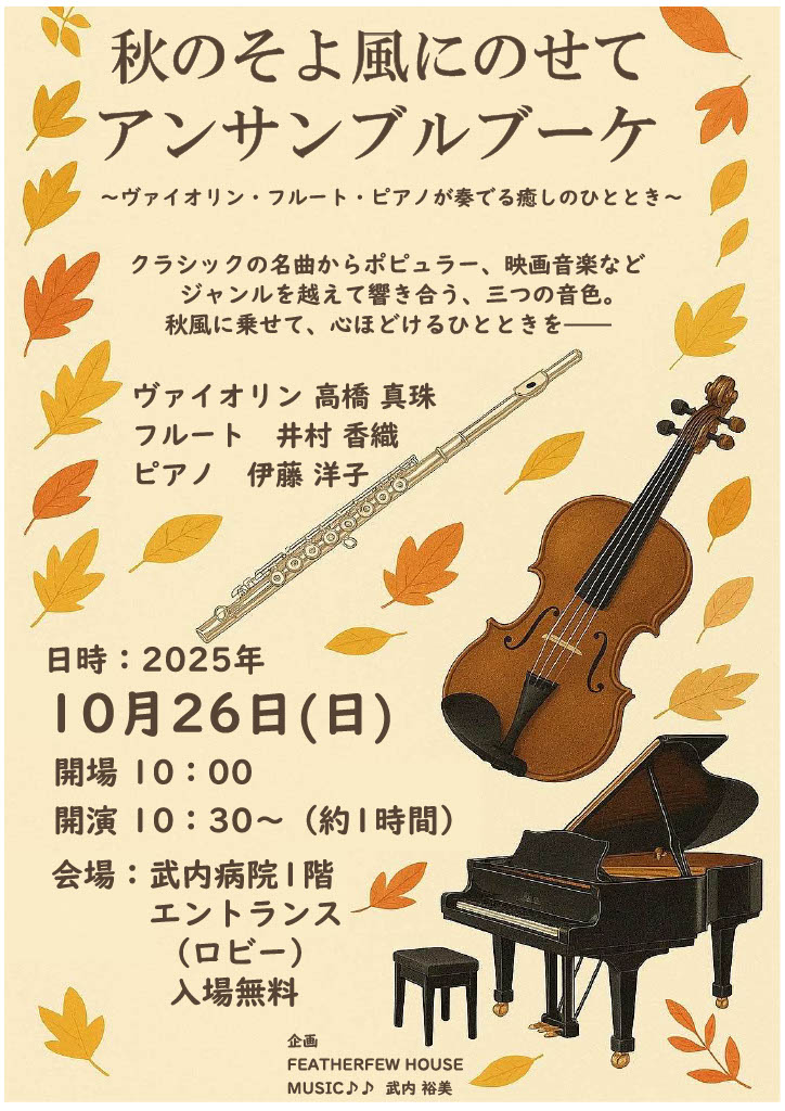 来たる、10月26日(日)10時30分より約1時間、武内病院1階エントランスにて