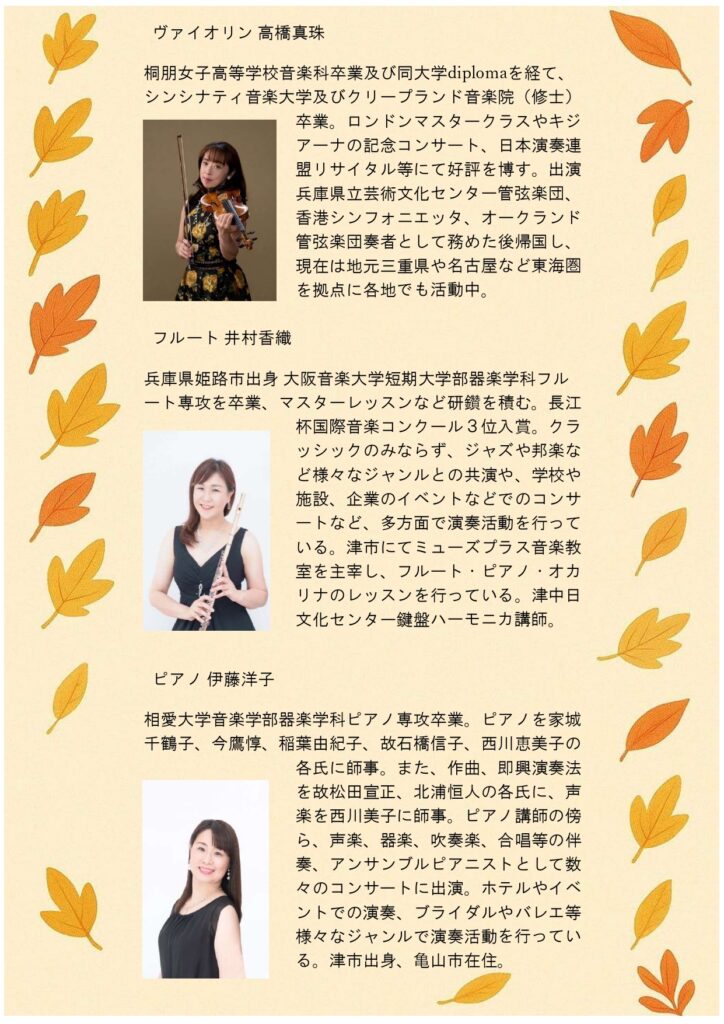 ヴァイオリン、フルート、ピアノによるコンサートを開催いたします。
